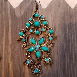 Statement earrings about 2.25" long, in a beautiful teal and aquamarine colored stone floral filigree layout, with a brass and gold plated backing and three dangling floral pendants on each earring. Never worn, no flaws