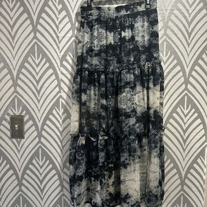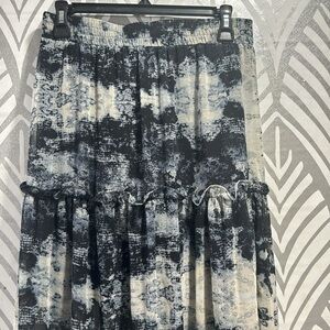 NWOT Tregene tiered skirt. Fabric is flowy and lightweight. Skirt is partially lined. Black blue and white print. Waist measures 29 inches. Elastic waist band. Length is 40 inches and lining measures 19 inches from waist.
