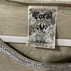 NWOT Vocal short sleeved women’s shirt with rhinestone embellished neckline, light khaki color