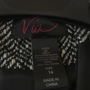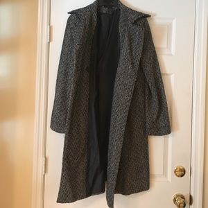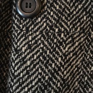 NWOT wool trench style with out belt style coat. Black and white with silver string running through. Fully lined. Has pockets on side of coat. And buttons in breast area. I am 5 " 6 and it comes below my knee. Was bought from Victoria Secret. Maybe worn once.