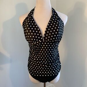2 Bamboo black and white polka dot one piece bathing suit with back neck tie, padded bra and tummy control. Brand new and never worn. Bust 40”