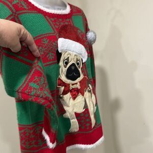 Who doesn't love those puppy dog eyes? This sweater is so much fun!! It has a cute pug with a sequined Santa hat with a silver tinsel poof ball. The collar has bells on it and the fur is soft to the touch. It has a white , fuzzy trim around the collar, hem and sleeves. The background is red and green checkered with snowflakes. This is the perfect sweater for the holiday season, the office, Christmas card pictures or parties. NWOT.