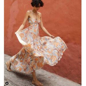 The modern-inspired halterneck style elevates this chic maxi dress styled with pleated skirt.