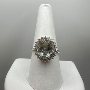 This is a stunning 9x12mm oval cut Prasiolite, surrounded by a halo of cz diamonds! It is not stamped sterling silver, but my entire collection is made from solid sterling silver.