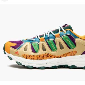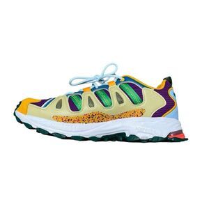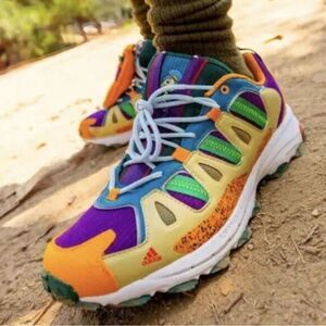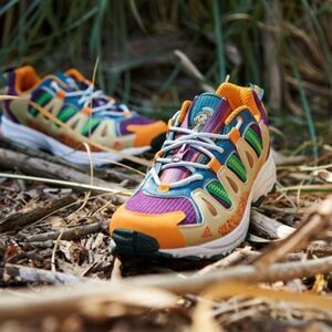 Multicolor Trail Shoes. These vibrant shoes feature a mix of orange, purple, and green, perfect for adventure.