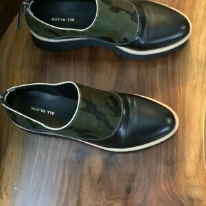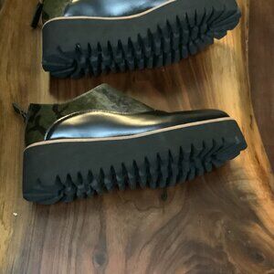 NWOT-ANTHROPOLOGIE/FALL BLACK LEATHER/CAMO WEDGE ZIP UP PLATFORM -USA 7