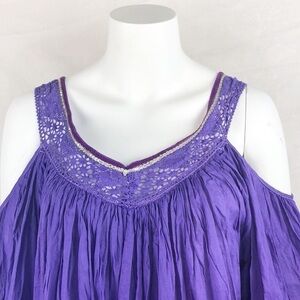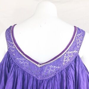 Brand new. Never worn. No tags. This vibrant purple mini, boho chic casual is so soft, Looks so comfortable, so soft, and so flowy !! Intricate Crochet details on deep V neck front and back. Embellished with pomp pomps, Tassels, gold embroidered border. Generous Cold shoulder cut out. Great resort piece, beach coverup or just a fun short dress.