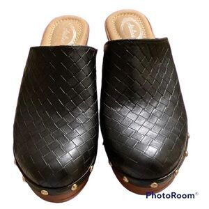 ✨ NWOT✨ATALINA FAUX LEATHER WOVEN PATTERN STUDDED HEELED CLOGS✨