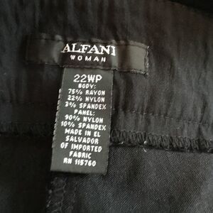 New without tags. Alfani brand (high end private label for Macy’s) Womens size 22WP black cropper straight leg slacks. These have an inseam of approx. 25”. Features two front working zippered pockets. Feature nylon/spandex Tummy panel built in. Comfort and stretch brought to you by Spandex! Showing photos of front and back sides along with fiber contents tag.