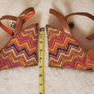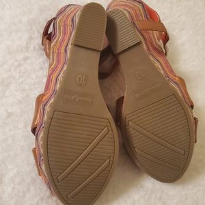 These new copper brown wedge heels are mixed with a multicolored fabric on the bottom of the shoe. With a zigzag design on the bottom of the shoe. Size 10, great with capri's, shorts, skirts and summer dresses.