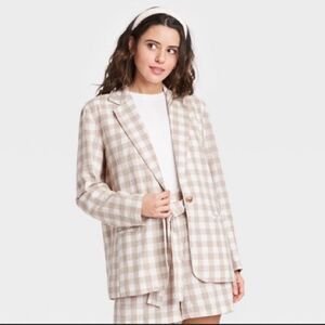 A new day Women’s jacket. Jacket size:L. Color: Cream Gingham Material: 55% Linen, 45% Rayon Lining: 100% Polyester Fit: Oversized •Length: Below Hip •Garment Style: Long Sleeve, Front Button •Cuff Type: No Cuff •Pockets: Front Pocket •Care and Cleaning: Machine Wash & Tumble Dry. It's styled with notched lapels, functional front pockets, and a single button closure to define the classic shape. Layer it over a plain tee, formal blouse or turtleneck paired with anything from trousers to jeans to a skirt to create a number of versatile style. Measurements are approximate laying flat Pit to pit=25" Length =30". Thank you for stopping by my closet! Ships Same/Next Day - Bundle & Save -2 or more items 20% Off! - for Price Drops/Private Offers! Happy Poshing!