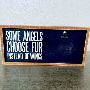 NWOT Primitives by Kathy rustic wooden farmhouse picture frame clip holder display decor sign. “Some Angels Choose Fur Instead of Wings”. Approx 7” tall.