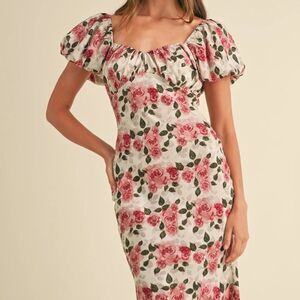 Satin floral print ruched sweetheart neckline short puff sleeve midi dress. Lining.