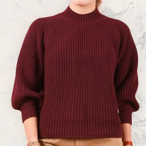 The cotton and cashmere blend sweater has a funnel neck, three-quarter puff sleeve, and rib knit details throughout a relaxed fit