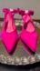 These gorgeous pumps are filled with colourful shades and interesting textures. Presented with a strappy ankle fastening and a classic pointed toe. A stiletto Heel about 4” and a beautiful dark fuchsia pink color.