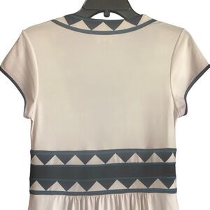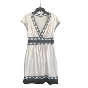 BCBGMAXAZRIA Mini featuring an A-line silhouette, deep v- neck, banded waist and a geometric border print. Stretchy. Sexy. Flirty. Fun. Lined. Excellent condition.