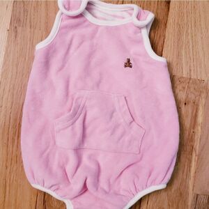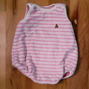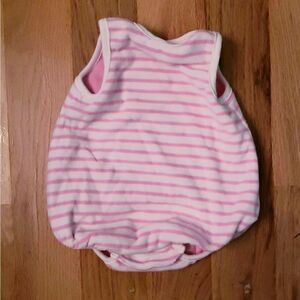 New without tags. Very cute and unique sleeveless Romper. Solid pink with white trim on one side and pink with white stripe on the other. Super soft terry knit. Size 3 months