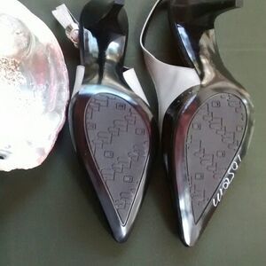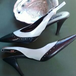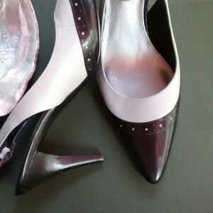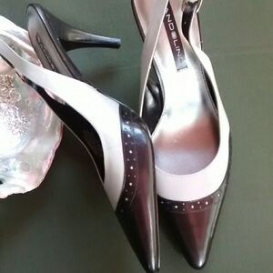 NWOT. Style: Summer Day. Gray and black leather, strap with buckle and elastic. Perforated pointy toe. Worn in the store only. Size 8 measures 3.5 wide, 10.5 long, black wooden heel is 3.5 high. These are classic, you'll wear them forever.