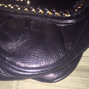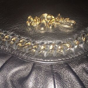 Home. This clutch has gold hardware and lots of room. The bag has a magnetic closure.