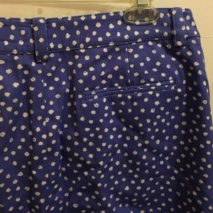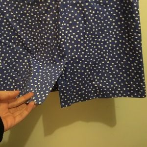 A classic silhouette. This never been worn skirt is perfect for Spring Summer. The playful dot pattern can be dressed up or kept casual. It has two side pockets as well at two in the back. It is 21" long. Made of Cotton, feels like light denim.