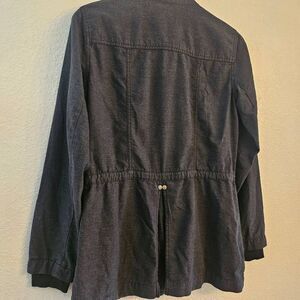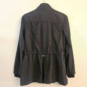 NWOT CAbi Weekend Moto Cinch Waist Fitted Stretch Flattering Jacket: Denim color