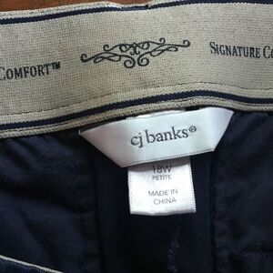 New without tags. CJ Banks brand women’s size 18W Petite navy straight-leg slacks. Signature Comfort elasticized 2” wide waistband. Front zipper and button closure. Cotton & spandex blend for comfort and stretch. Inseam length of 27”. 5-Pocket style. With belt loops. Showing photos of front and back sides along with fiber contents and care information.