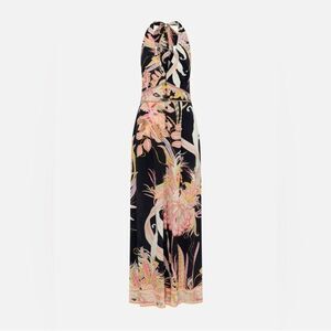 Design: The jumpsuit features a halterneck with a tie closure, a shaped panel waistband, and wide-leg pants. It's made of silk crepe and features a black background with a vibrant floral and butterfly print in shades of pink, yellow, and orange. The print, named "Lady of the Moon," illuminates a night sky with butterflies dancing among patterned florals and flourishes. It is part of the Amore Mio collection.