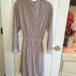 New without tags. Charter Club brand Women’s knit wrap around robe in a heathered/marled mulberry color. Accented with white, soft lace at neckline and sleeve cuffs. Inside tie and outside belt which is sewn on in the back (so it can’t be lost!). Size is Large. Soft and cozy. Showing photos of front and back sides along with fiber content information tag.