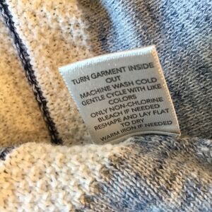 New without tags. From Christopher & Banks brand. Women’s size Medium Petite sweater top. Can be worn alone as a top or over a shirt as a sweater. 3/4 length sleeve, white waffle knit with navy blue marled knit stripes. Knit cuffs on round neckline, cuffs of sleeves and hemline. Short slit at sides on hemline. Showing photos of front and back sides along with fiber content and care info.