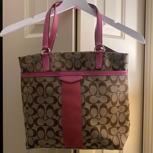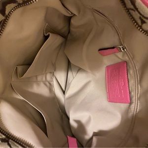 Beautiful Coach signature bag in tan signature canvas with patent leather pink Stripe and handles. Beautiful silver hardware. Inside zipper pouch with Coach Creed with pink patent leather zipper pull. Other side two pockets one for cell phone. Inside is immaculate. Bag is mint ..no rips, tears or stains from a non smoking and pet free home excellent bag.❤️