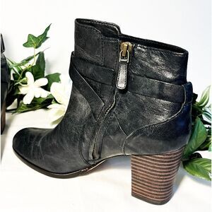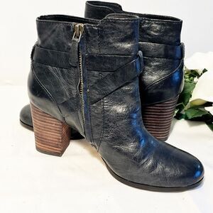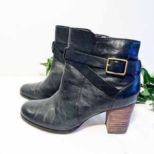 Beautiful brand new Cole Haan leather ankle booties. Faux stacked wood heel. Inner zipper closure. Buckle and strap accent. Left heel had a little odd coloring from manufacture. Hard to know if these are black or gray. In certain light they look gray and other looks black