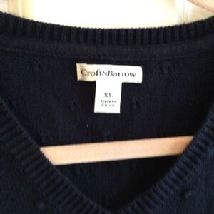 New without tags. Croft & Barrow brand (Kohl’s) navy women’s sweater in size XL. Gorgeous added raised dots texture throughout . V-neck, wrist-length sleeve, knitted cuff at neckline, cuffs and hemline. Showing photos of front and back sides along with fiber content and care tags.