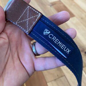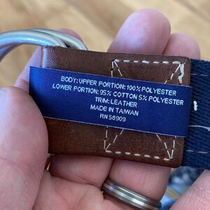 Colors are navy, moss green and gold. Measures 46.5” x 1.5”.