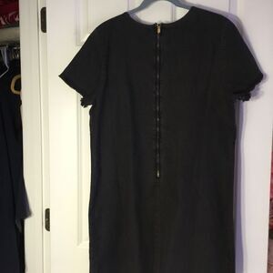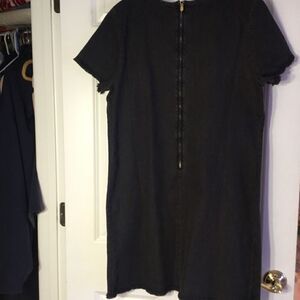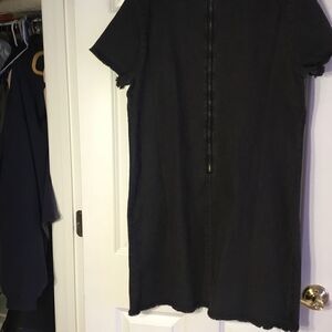 Brand new without tags. Size 14 Dark Black Denim A-line dress, short sleeved. Raw fringe on bottom and sleeves. Faux pockets in front. Gold zipper 19 1/2” in length. 75% cotton, 23% polyester and 2% spandex. Wonder brand. Approx. measurements: Bust: 42”; Waist 41” Hips 44”. Length: 35 1/2” from back zipper top to hem.