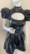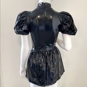 Stylish black vinyl dress with puff sleeves. Perfect for a bold look. Features an attached o-ring choker. New without tags.