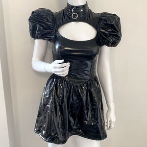 NWOT Dolls Kill Brand Widow Black Puff Sleeve Vinyl Mini Dress w Cutout Detail
