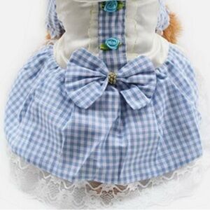 Charming blue gingham dog dress featuring a bow and lace trim. Perfect for special occasions.
