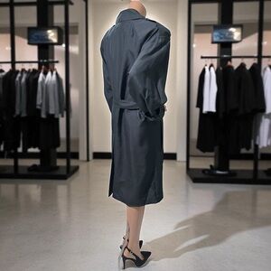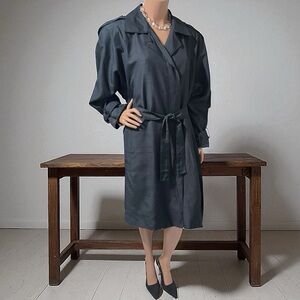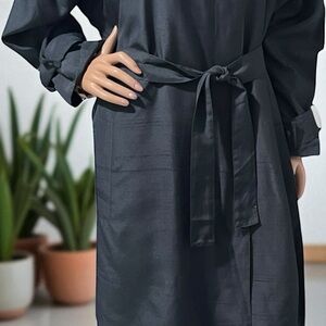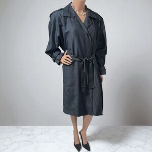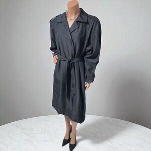 Stylish black coat with a belted waist and two side pockets Perfect for a chic look. 100% silk stunning and elegant. It Business and this jacket/coat represents that you’re to be taken serious.