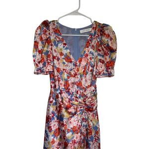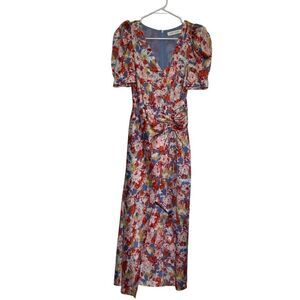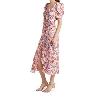 NWOT FLORET STUDIOS Floral Satin Faux Wrap Puff Sleeves Chic Midi Dress XS