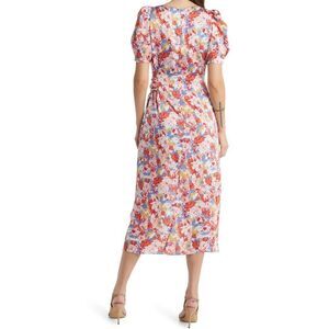 NWOT FLORET STUDIOS Floral Satin Faux Wrap Puff Sleeves Chic Midi Dress
