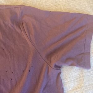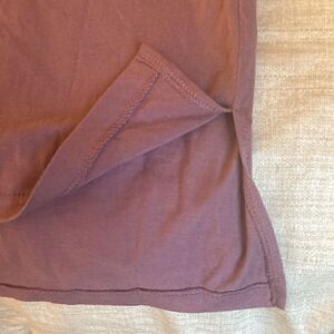 Featuring high low vented hem, short sleeves and a Crewneck. Very soft fabric in deep mauve. Size large. Loose fit.