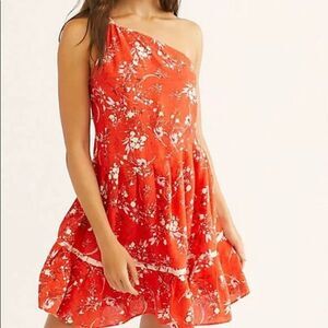 NWOT Free People Womens Floral One Shoulder All Mine Mini Dress S Red White Ruffle.
