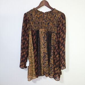 Perfectly printed in a pieced design, this timeless tunic is featured in a babydoll-inspired silhouette with smocking at chest for added dimension.