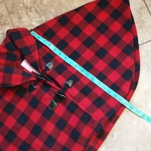 Features a buffalo check or plaid print and 2 toggle button closures in the front. Great layering piece to add some extra warmth. In good pre-owned condition. One size fits most.