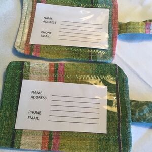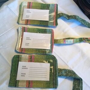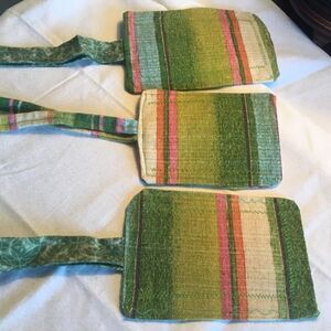 Set of 3 NWOT Handmade Luggage/Backpack Tags made from all new home decor fabric. Showing you front and back sides. This set features green striped fabric.
