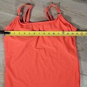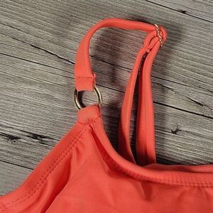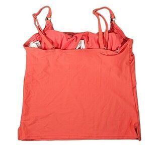 This coral tankini swim top has an underwire and adjustable straps for great support and finished with little gold rings at the front. Removable padding NOT included. Content: 82% nylon, 18% spandex. Care: hand wash, line dry.