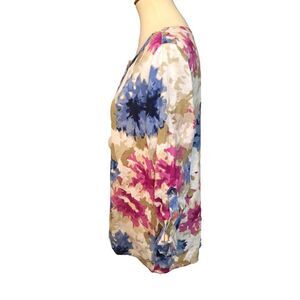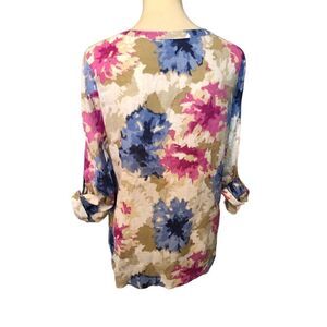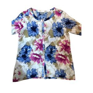 NWOT JM Collection Womens Blue Pink Floral 100% Linen Tunic. Decorative button down with roll tab sleeves. Vibrant colors. 100 percent linen. Light and breathable.