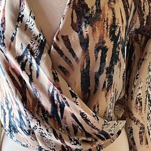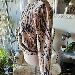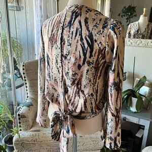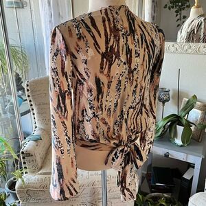 Peach colored satiny long sleeve top. Crossover front with snap closure. Elastic in wrist hem. Wide band at ack bottom with tie closure. Small opening at lower back above the bow. Green, tan, peach and black animal print accent pattern throughout. **Does have a small snag on one sleeve, see pic**
