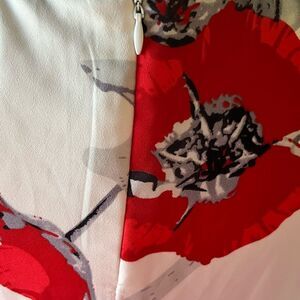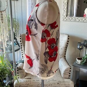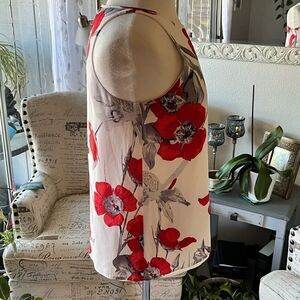 Beautiful two layer semi sheer top with zipper closure in the back. Vibrant orange is red floral pattern throughout with grays. Underneath is a solid white layer. Top layer in back has a slit down the back.