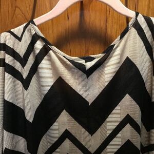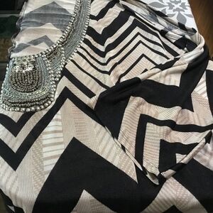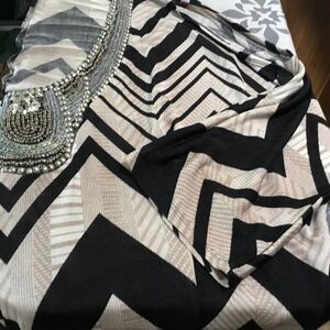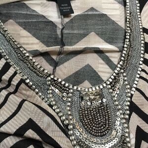 New without tags. Lane Bryant women’s size 18/20 “cold shoulder” short-sleeved knit blouse. Tan, black with a touch of white in a zig zag print. Spectacular beaded neckline on the front in silvertone. Showing photos of front and back sides along with fiber content and care information.